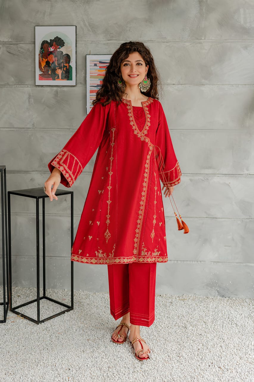 • Beautifully designed box pleated peplum cut from the high quality cotton in the shades of red . Embellishments feature intricately embroidered organza sleeves with subtle embroidery details on front