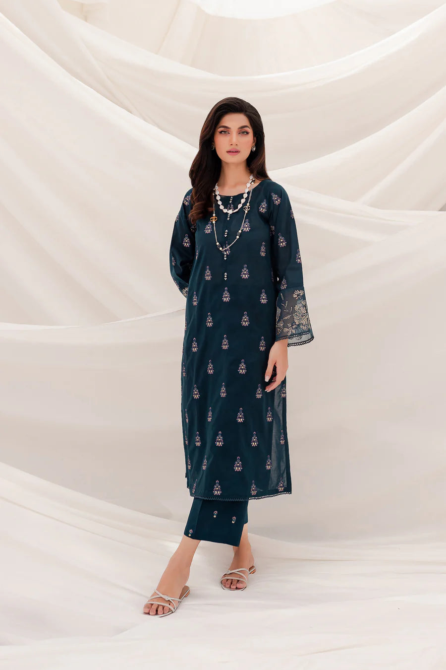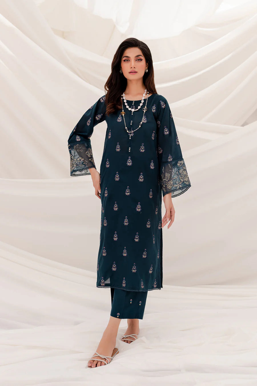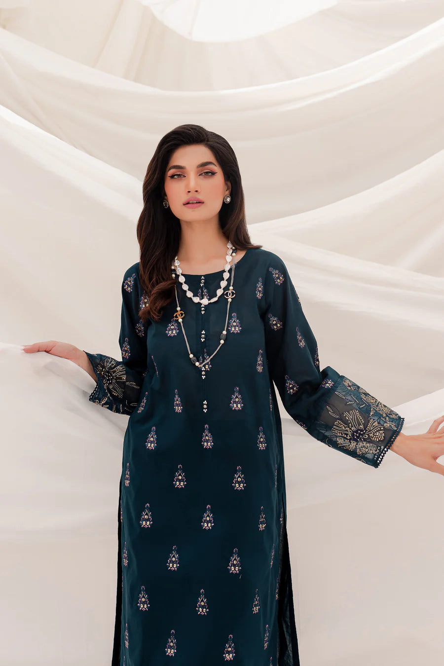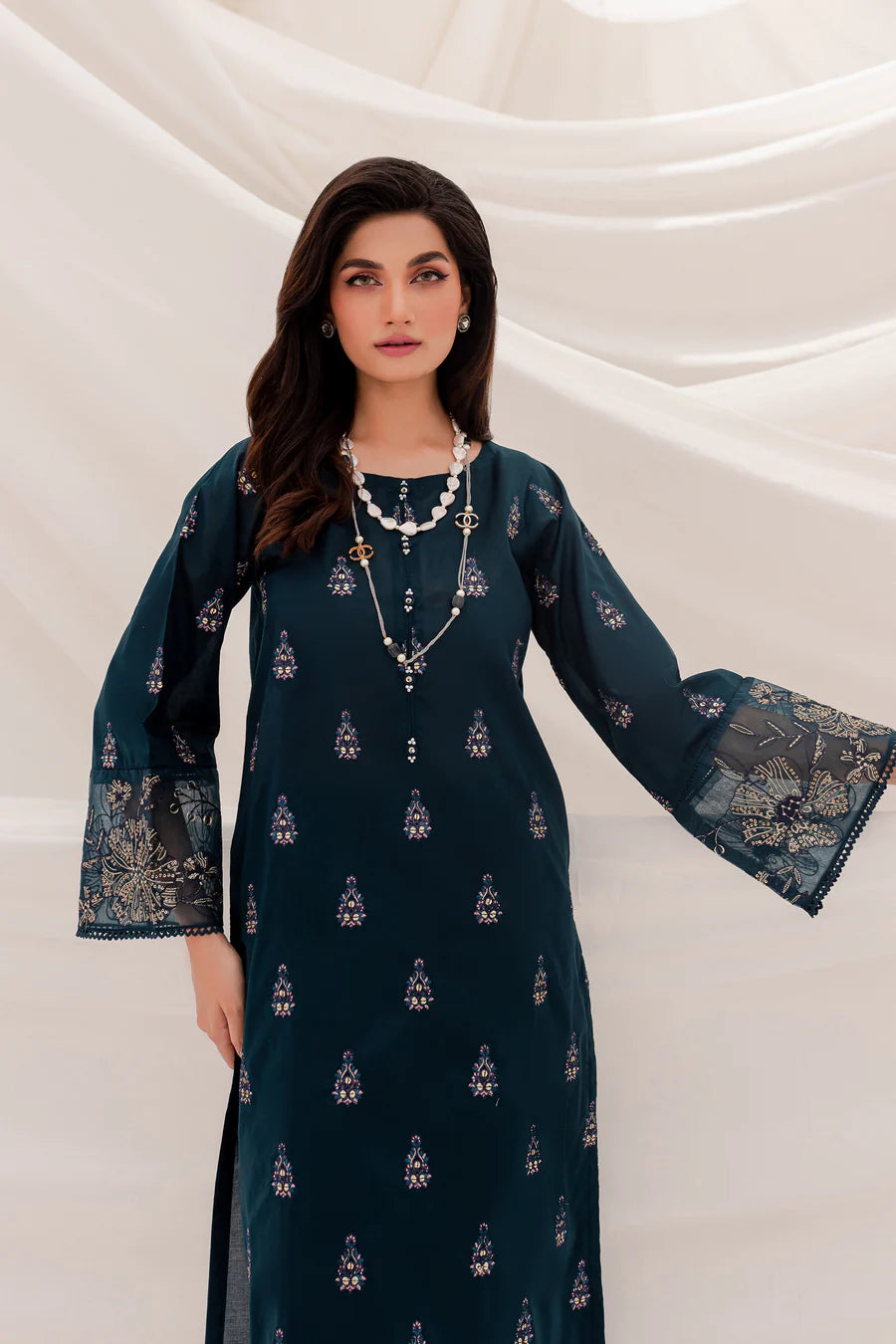 Gracefully designed long shirt cut from the highest quality COTTON in the shades of ZINC. Embellishments feature delicately embroidered shirt donned with 3D collage work on neckline and organza patch work at sleeves