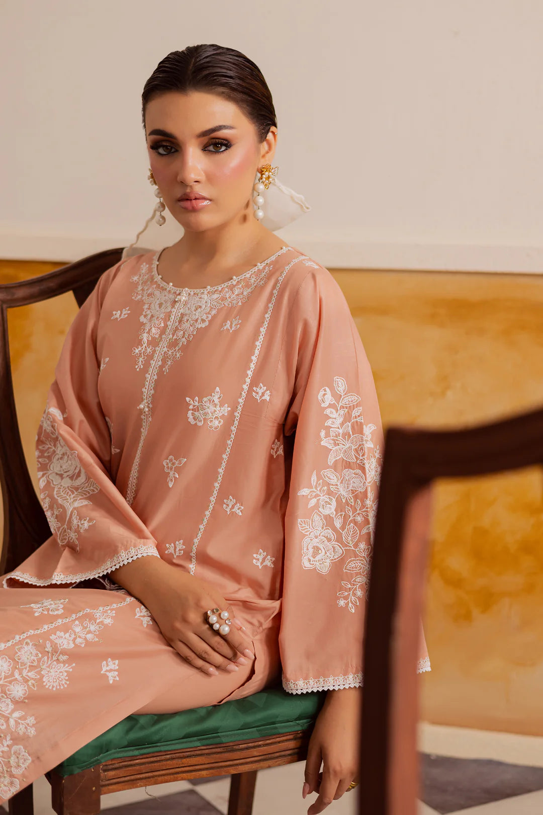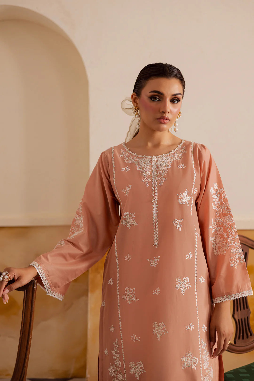 A short, panelled peach Winter Cotton  shirt featuring composed embroidery along the front and a sleek band collar neckline accented with subtle piping - echoing the sophisticated style seen in contemporary ban-collar designs. The flared sleeves are decorated with matching composed embroidery, giving the silhouette a gracefully feminine finish.