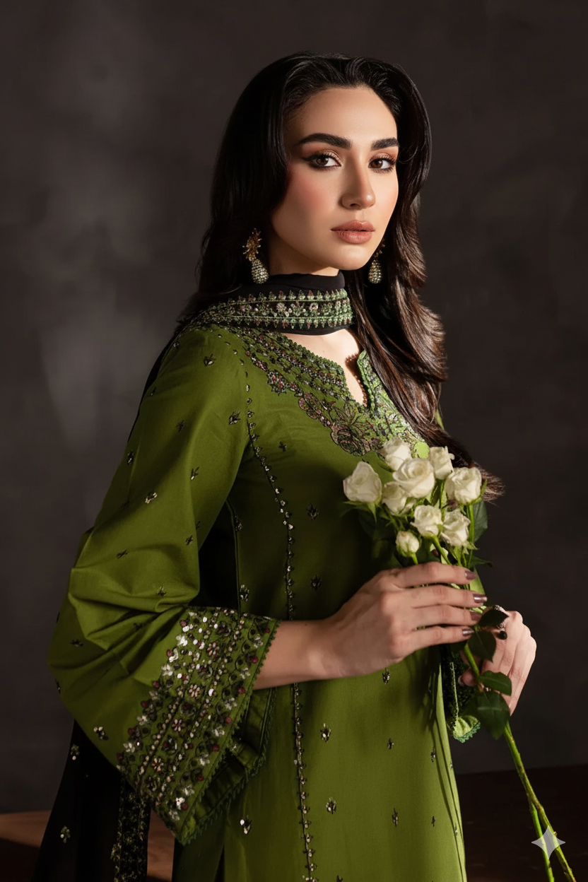 Indulge in classic sophistication with this Khaddar 3pc Fern ensemble. This elegant long shirt features composed embroidery, creating a beautifully intricate design throughout. The borders at the hem are finished with delicate lace, adding a refined touch to the silhouette. The shirt is designed with a keyhole neckline, also finished with lace, enhancing the overall sophistication. Intricate contrast floral embroidery adorns the shirt, providing a vibrant and detailed focal point. The flared sleeves, completed with embroidered borders, adds a touch of elegance.