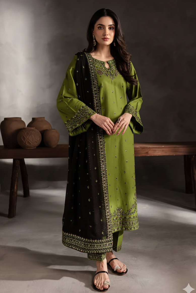 The ensemble is paired with regular Khaddar showcasetrousers, which showcases similar embroidered border at the hem, ensuring a harmonious balance with the shirt and completing the look with subtle refinement.