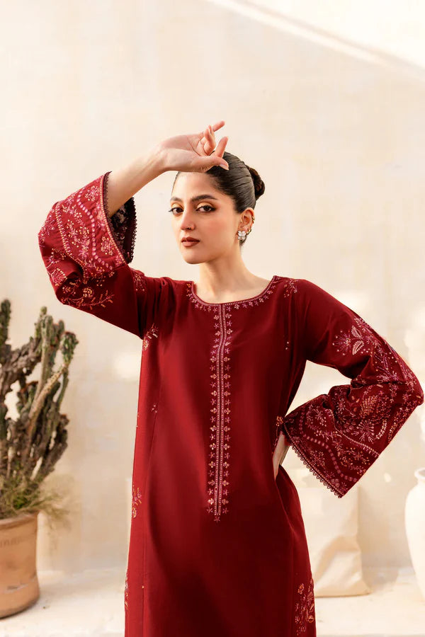 Make a lasting impression with our khaddar, where  maroon hues meet the finest quality khaddar canvas. Artfully paneled shirt presents a unique display of embroidery at neckline, sleeves, and side panels – embroidery is spruced up with sequin work.