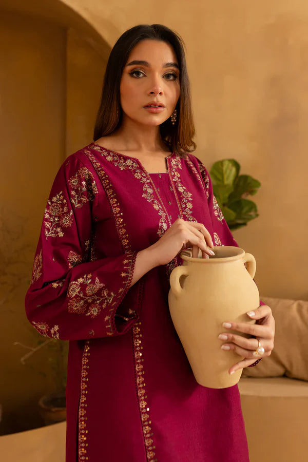 This chic beet root Cotton short paneled shirt features a beautifully embroidered neckline on the front, with intricate stitching details that add depth and texture. The shirt is enhanced with embroidered spread detailing on the side panels, creating a striking visual effect. The embroidered sleeves, finished with a delicate border, bring sophistication to the design.