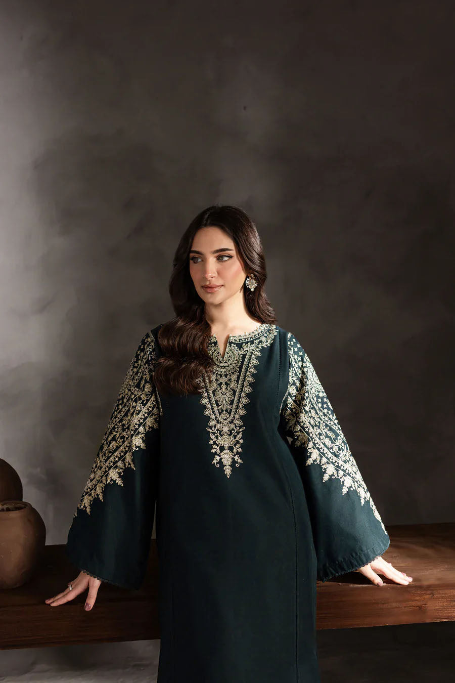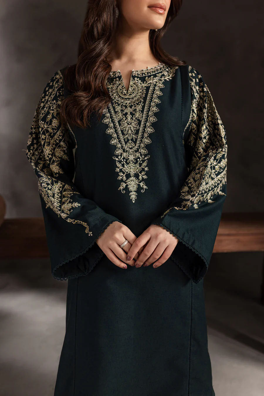 The khaddar shalwar features a delicate spread of embroidery along the edges. The embroidery on the trousers complements the shirt’s design seamlessly, creating a harmonious and stylish look.