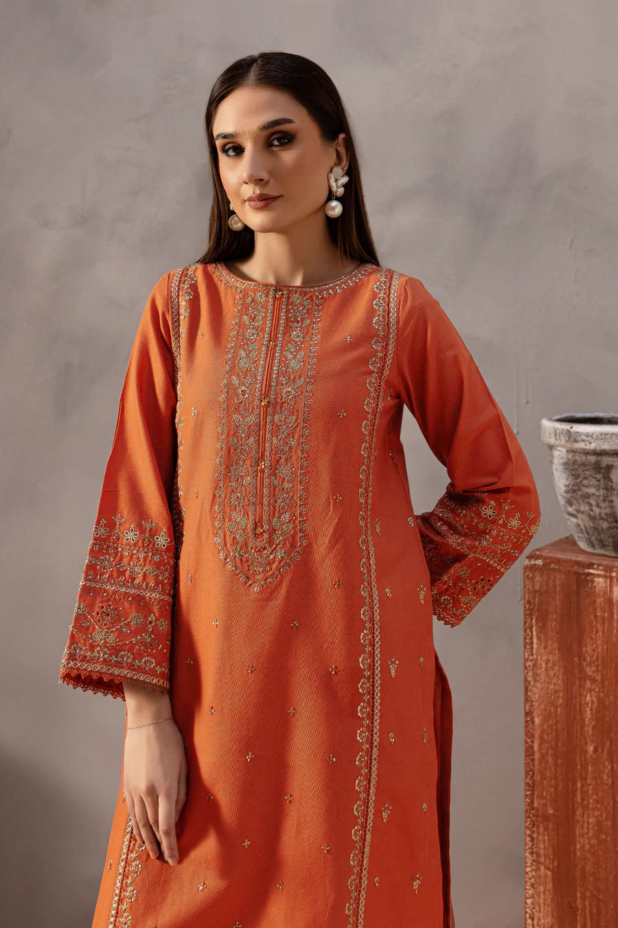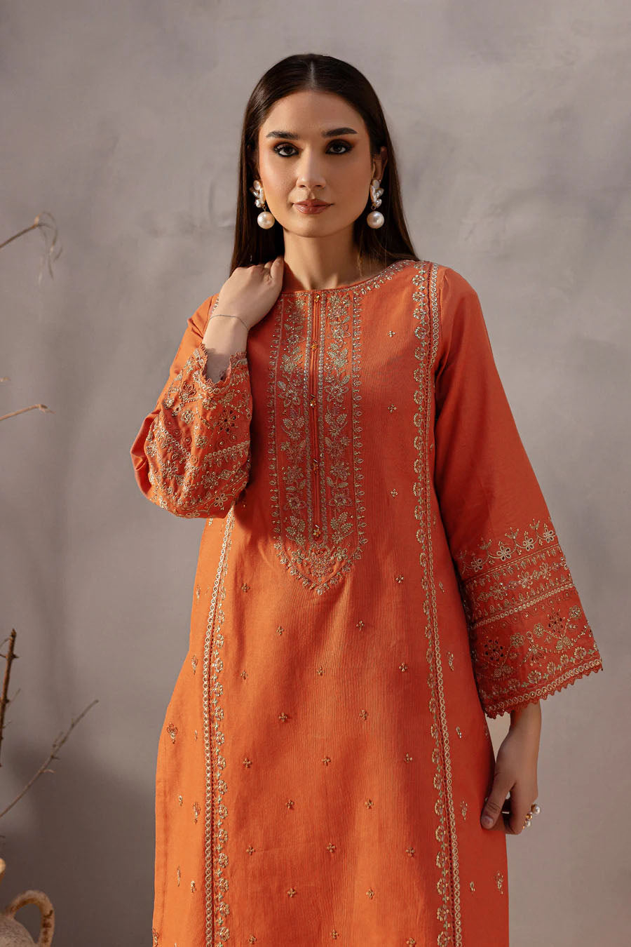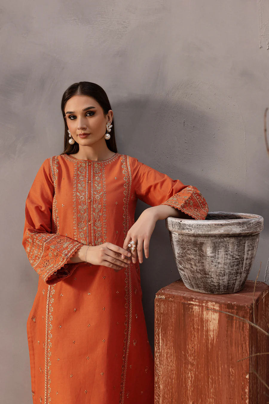 This exquisite 2-piece Rust Cotton features a long paneled embroidered shirt with heavy embroidery on both the neckline and sleeves, adding a luxurious touch of detail. The shirt is finished with delicate crochet lace, enhancing its elegance and femininity.
