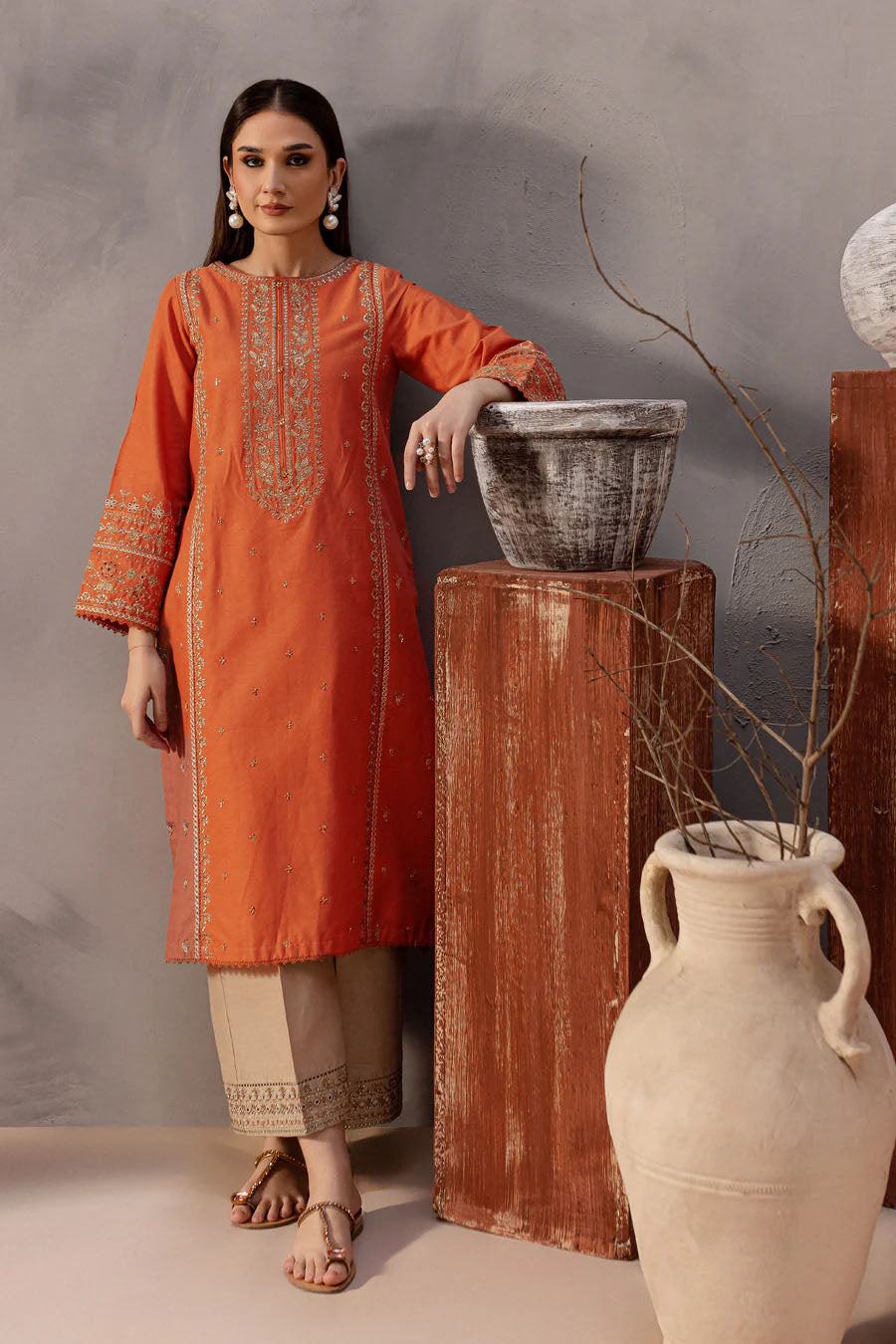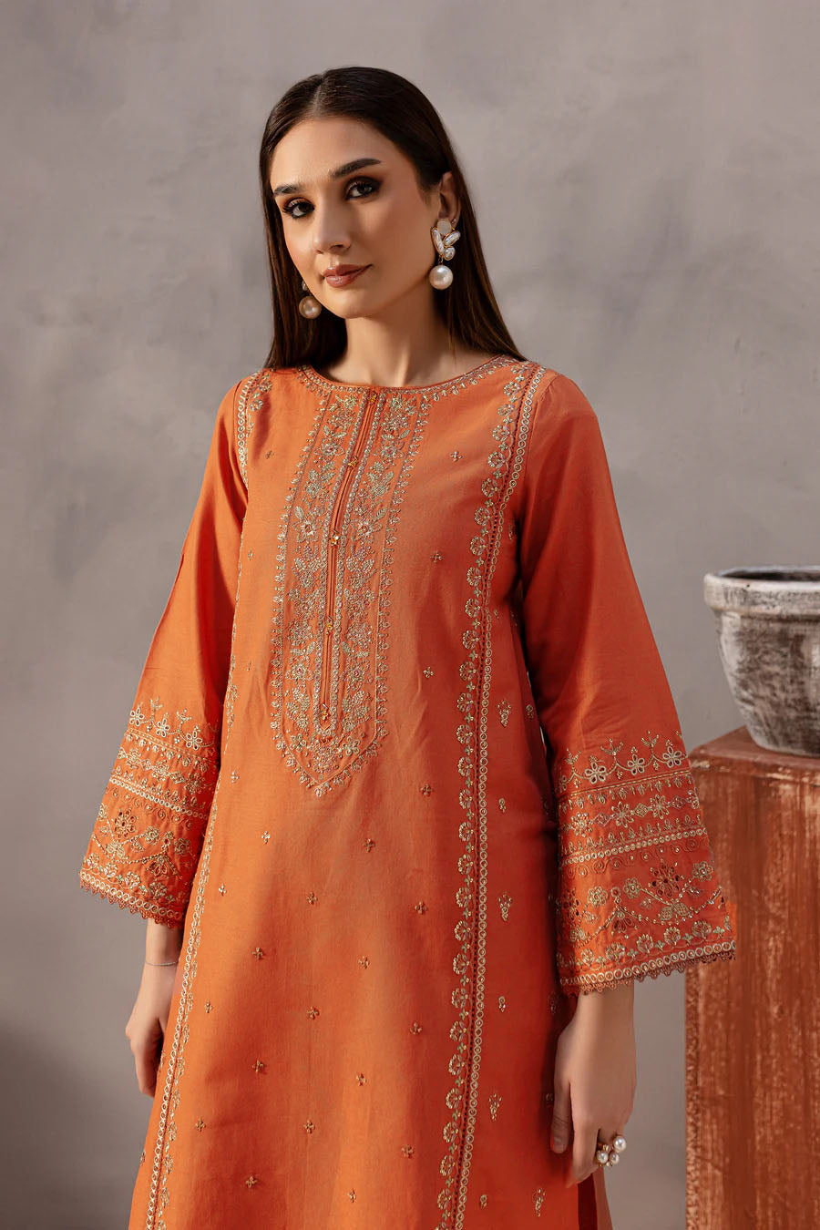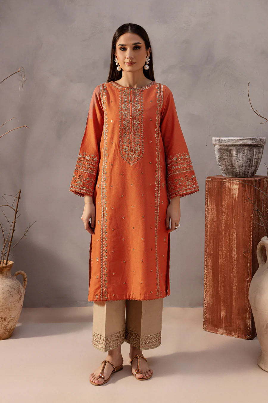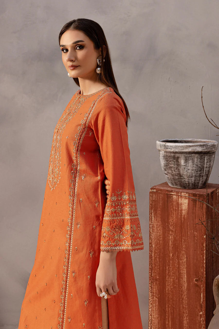 This exquisite 2-piece Rust Cotton features a long paneled embroidered shirt with heavy embroidery on both the neckline and sleeves, adding a luxurious touch of detail. The shirt is finished with delicate crochet lace, enhancing its elegance and femininity.