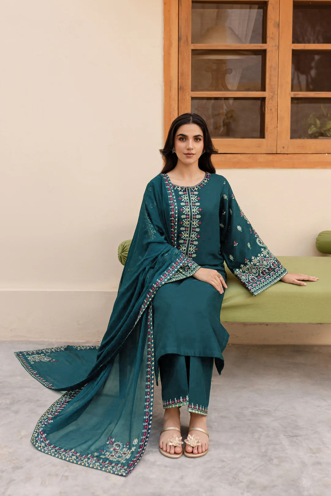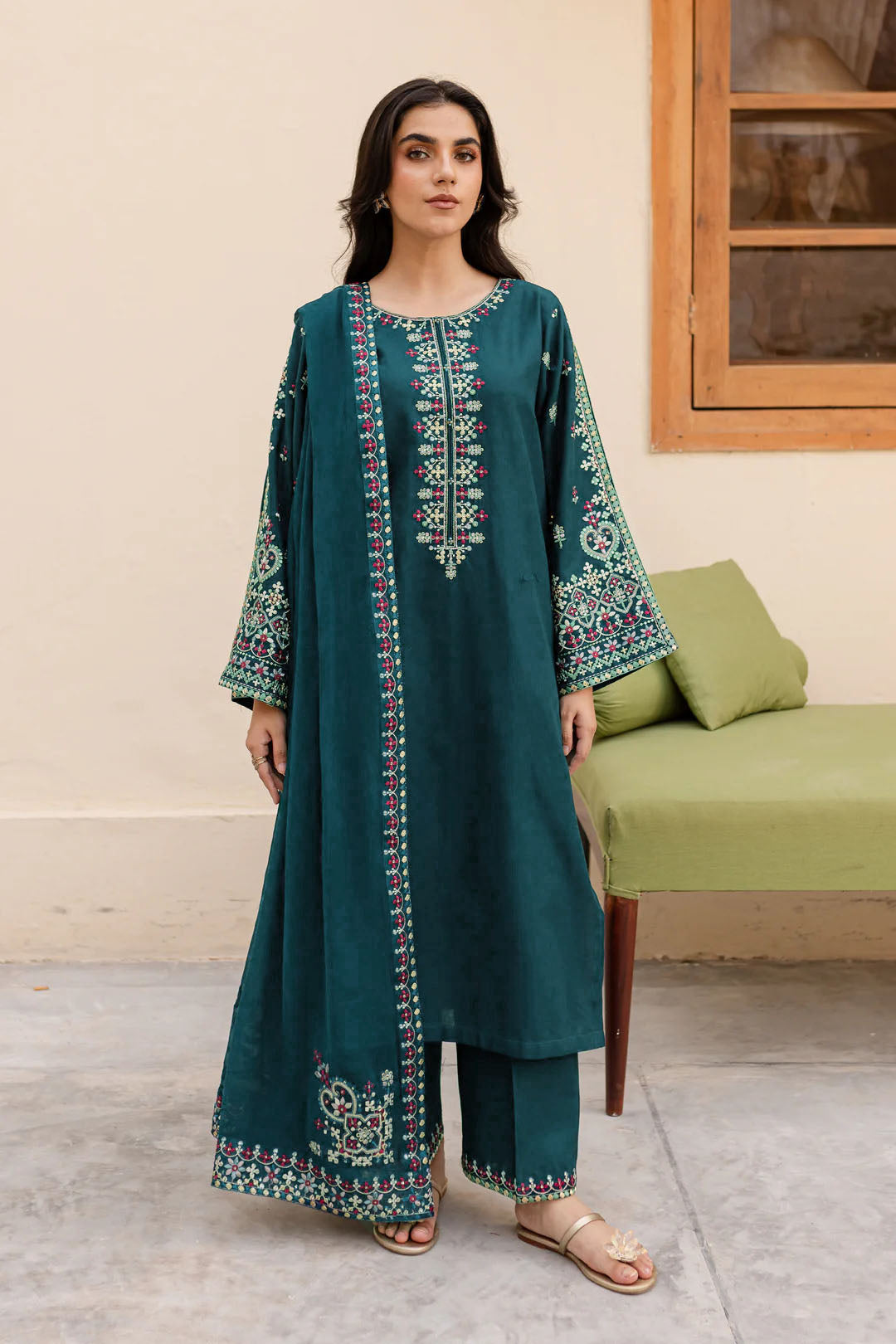 This ocean blue COTTON ensemble features a straight-fit shirt with intricate embroidery and collage finishing on the neckline. The loose-fit, fully embroidered sleeves add a sophisticated touch.